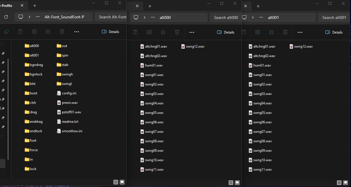 Please beware that alt000 and alt001 has to have exactly the same filenames in them. If there are 5 swing sounds in alt000, the must also be five swing sounds in alt001, with exactly the same names. Only the content of the files is allowed to be different.