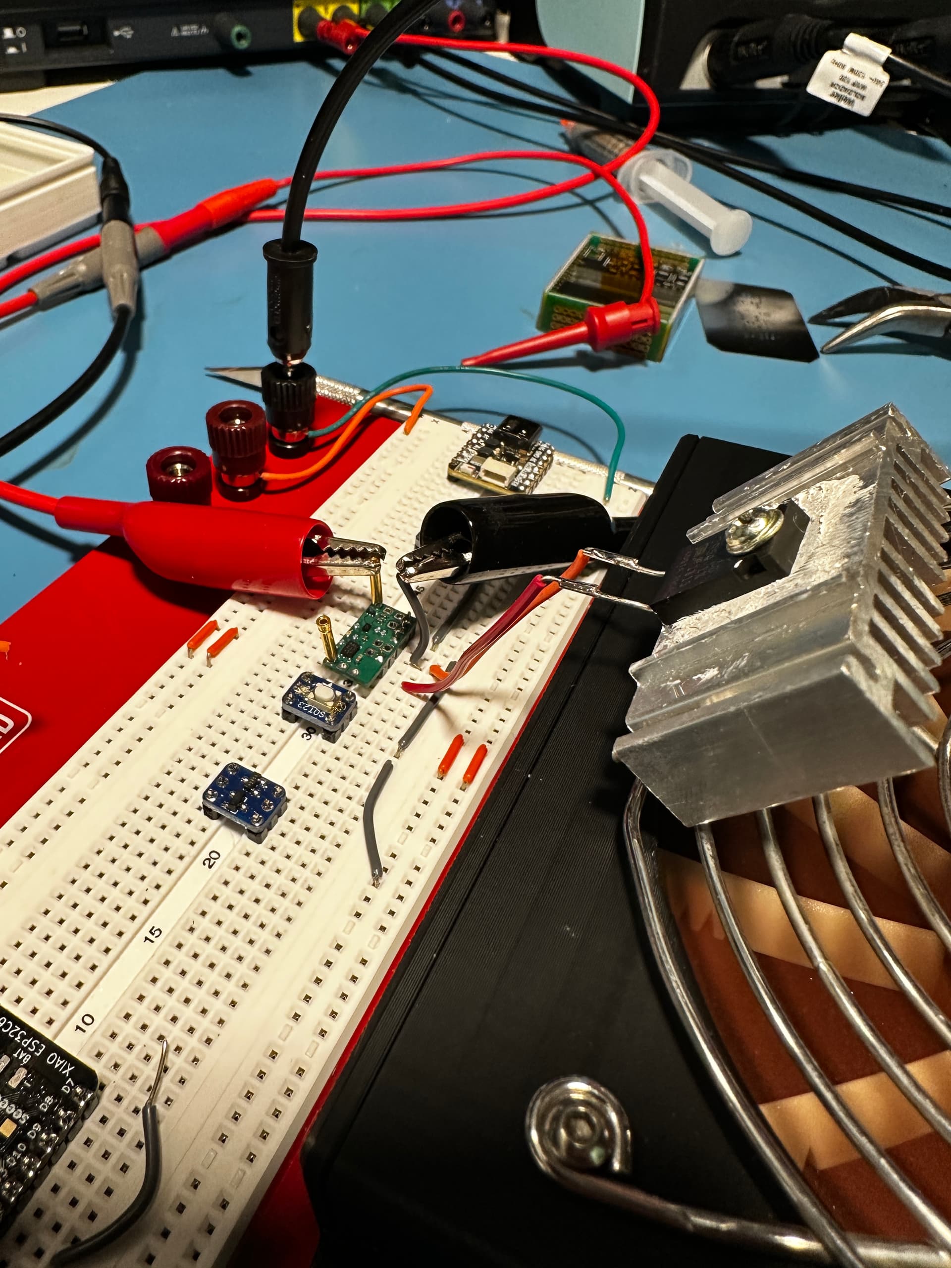 So far I have bench tested the logic (working), and just finished stress testing the high-side switch IC. With a 3-ohm load running at 4.9V and 1.6A (7.4W), the chip package is sitting at 77F after an hour…just above ambient of 74F: