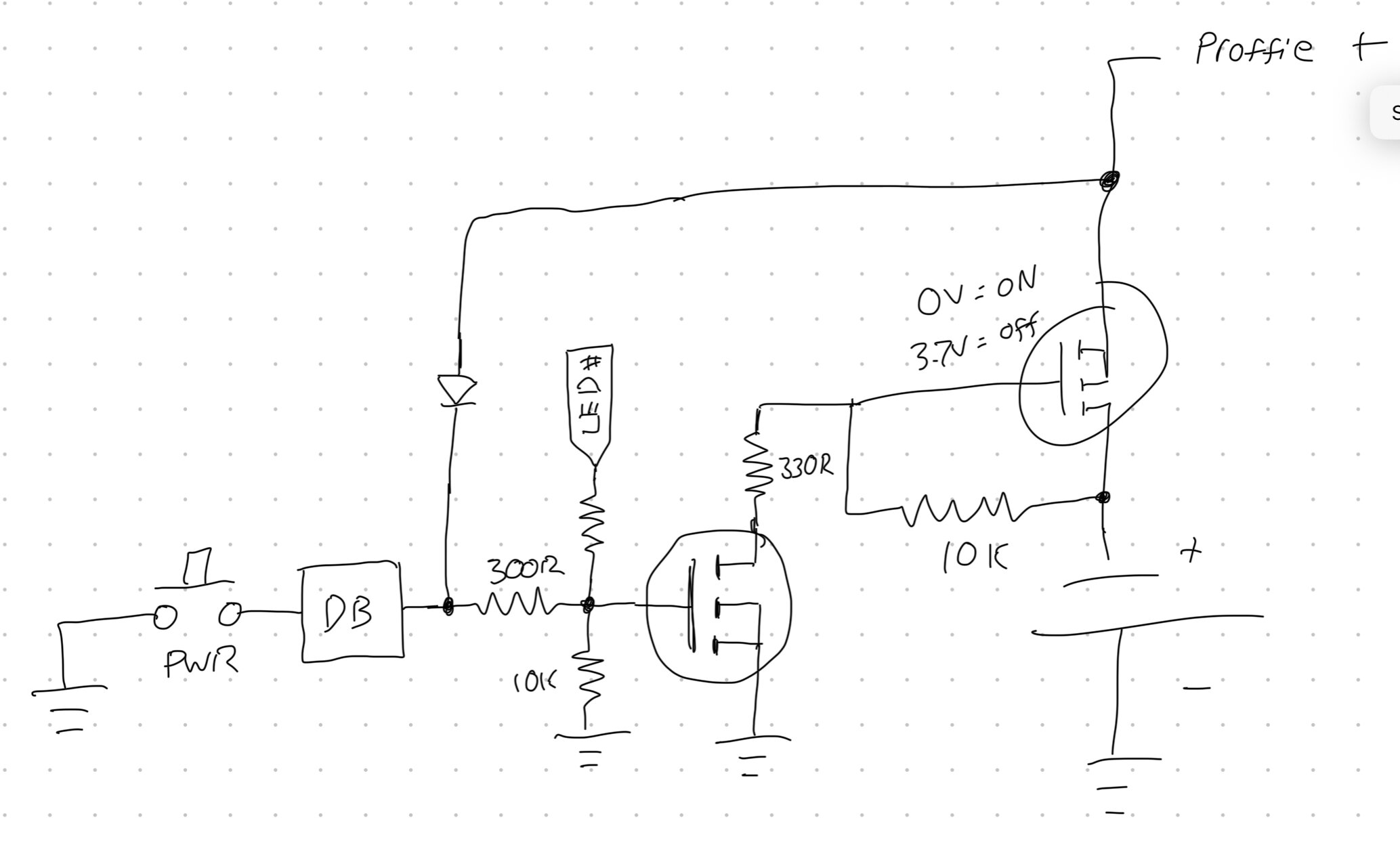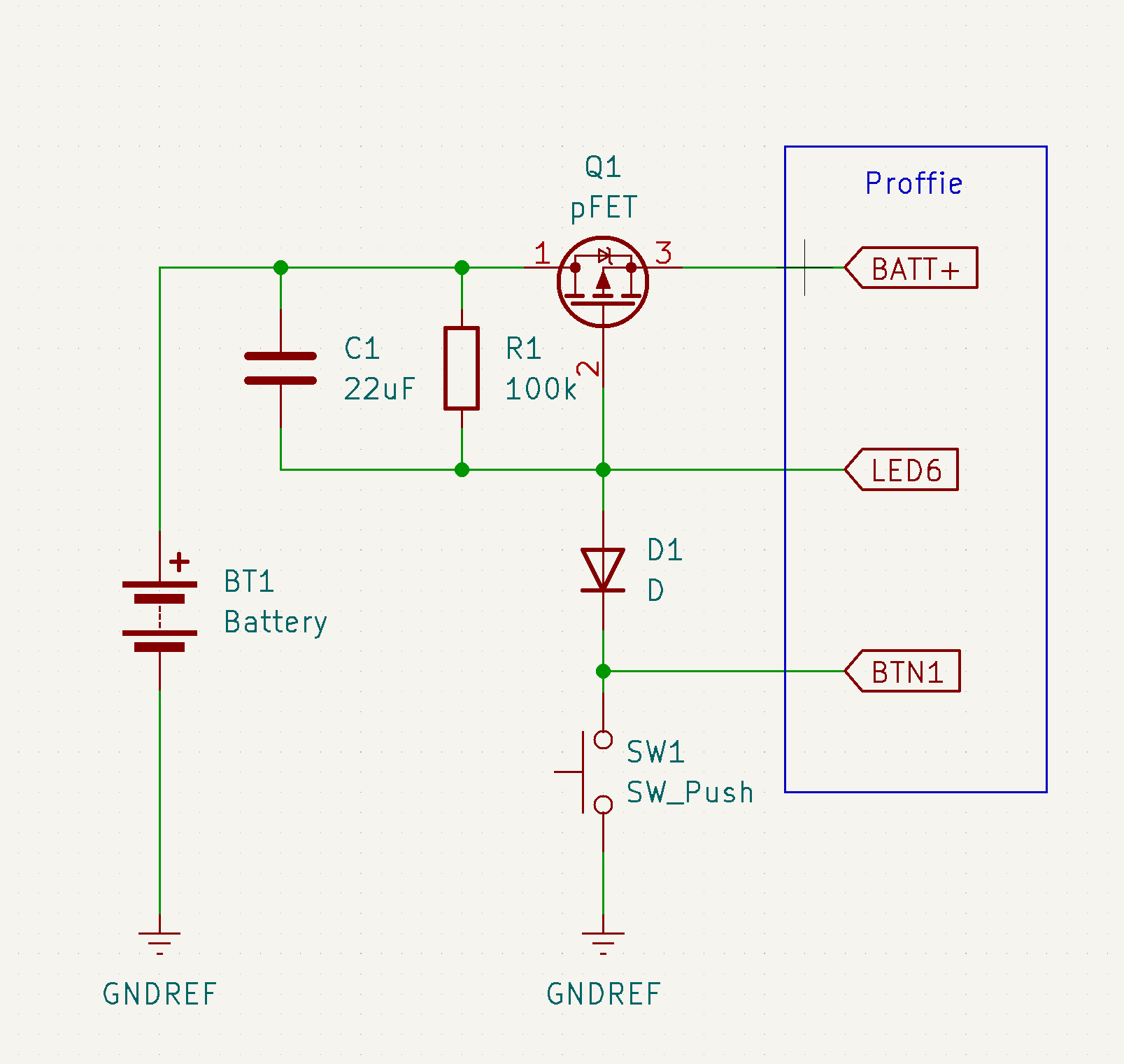 I think you might have pins 1 & 2 mixed up on the P-FET because the way it’s connected now the body diode will connect the Proffie to the battery.