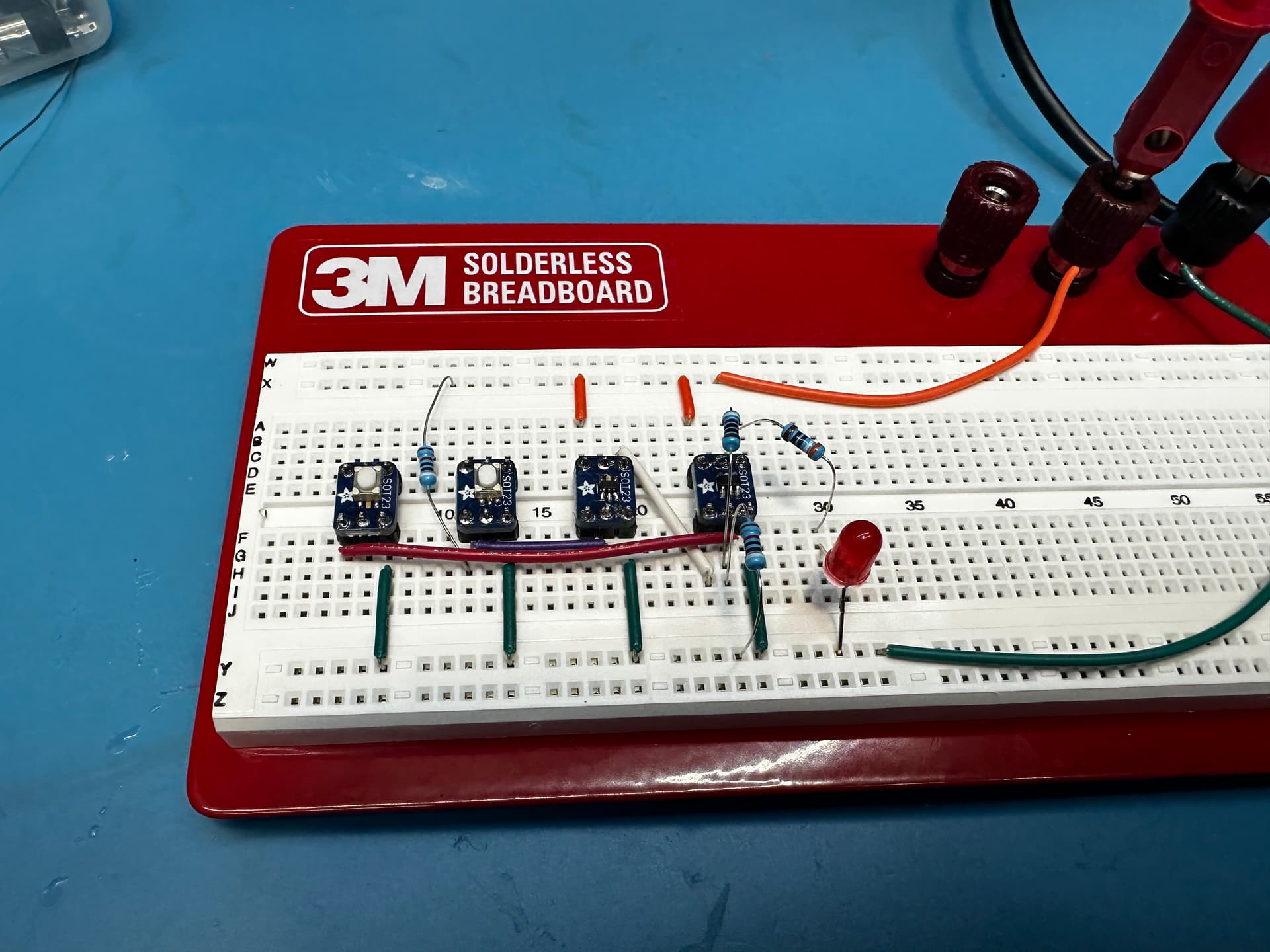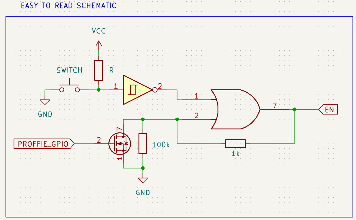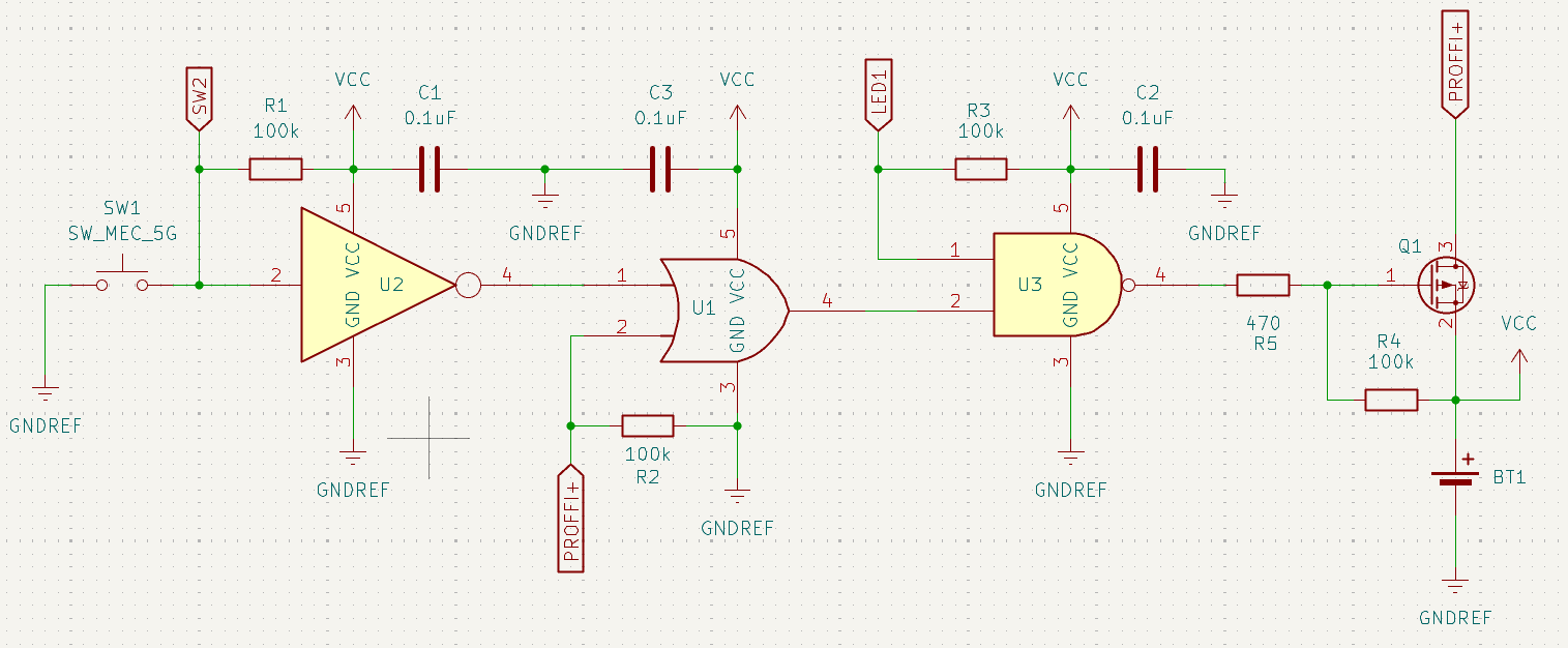 The function works perfectly. A button press latches on the OR gate, and only shorting the other OR input to ground causes the circuit to turn off…any button presses after the circuit turns on have no effect. The button pin is not affected by the latch state, which means it still works as a button for the Proffieboard. A 1K resistor prevents the OR gate from burning out when the FET is shorted to ground, but also allows the output of the gate to pull the input high through the 1:10 divider. The 100k resistor to ground ensures the input of the gate doesn’t float when power is off (the OR gate output goes high-Z). Here is a short video of the circuit working…the Proffieboard FET is replaced with a simple button in this example: