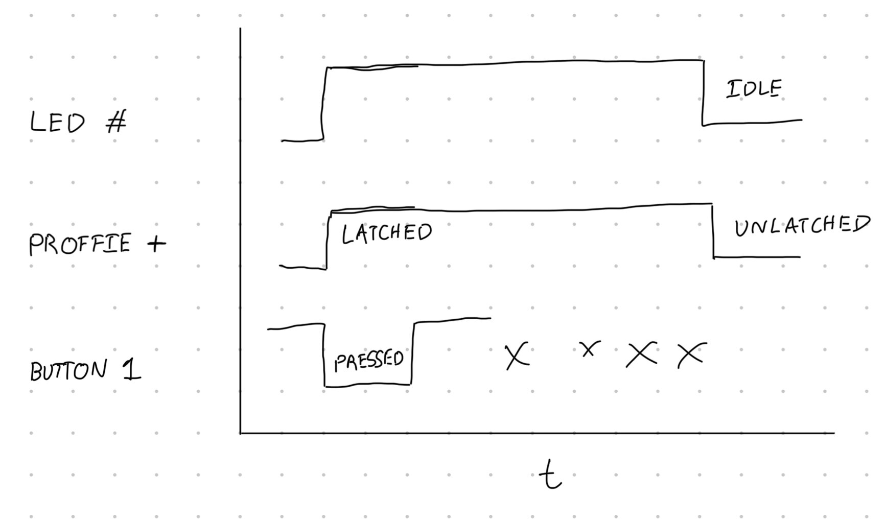To that end, could we use the power button to trigger a solid state switch that latches itself on? Once latched, further button presses have no effect. To shut down the solid-state switch, we pull the gate of the FET low using on of the LED FETs on the Proffieboard…right before going to idle state, for instance. Long story short, the power button doubles as a kill switch. I’ve drafted up a simple circuit diagram: