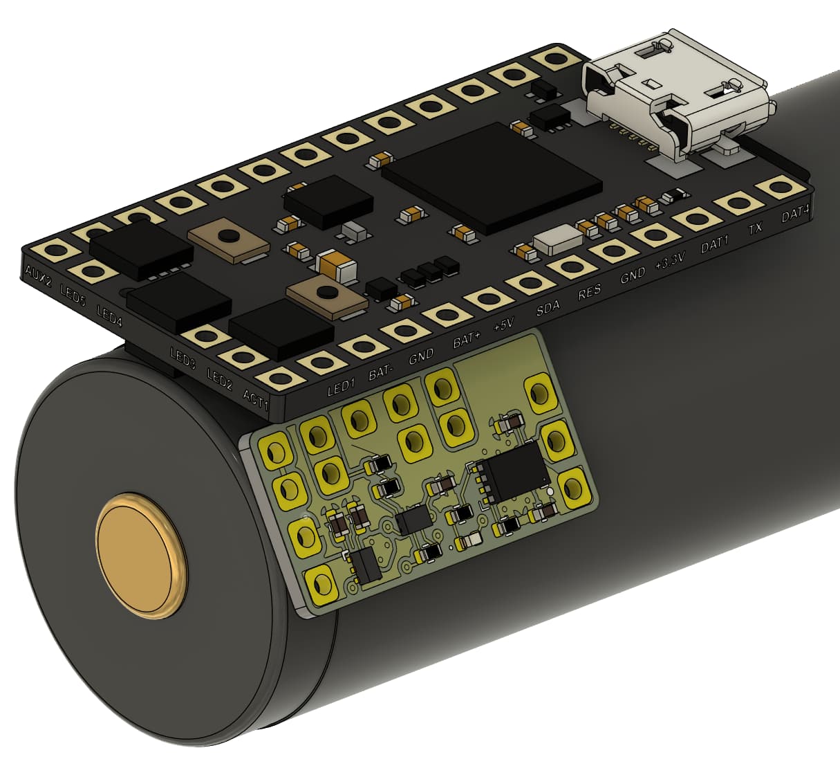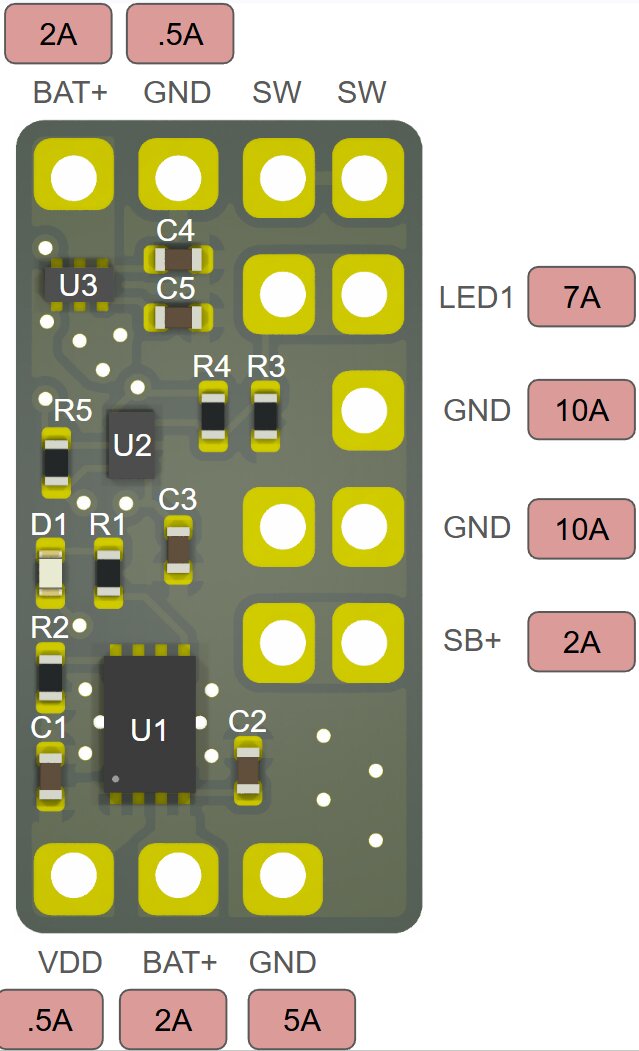 The board is pin-compatible with the Proffieboard V2.2 and V3.9, and allows the battery to be connected to this board instead of the Proffieboard (Except the blade positive). It will fit in a 25mm ID hilt next to an 18650 and Proffieboard: