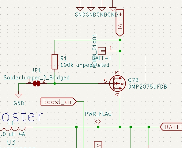 Without the solder jumper bridged, the Gate is pulled up to Batt+ and the FET never turns on…unless I am missing something?