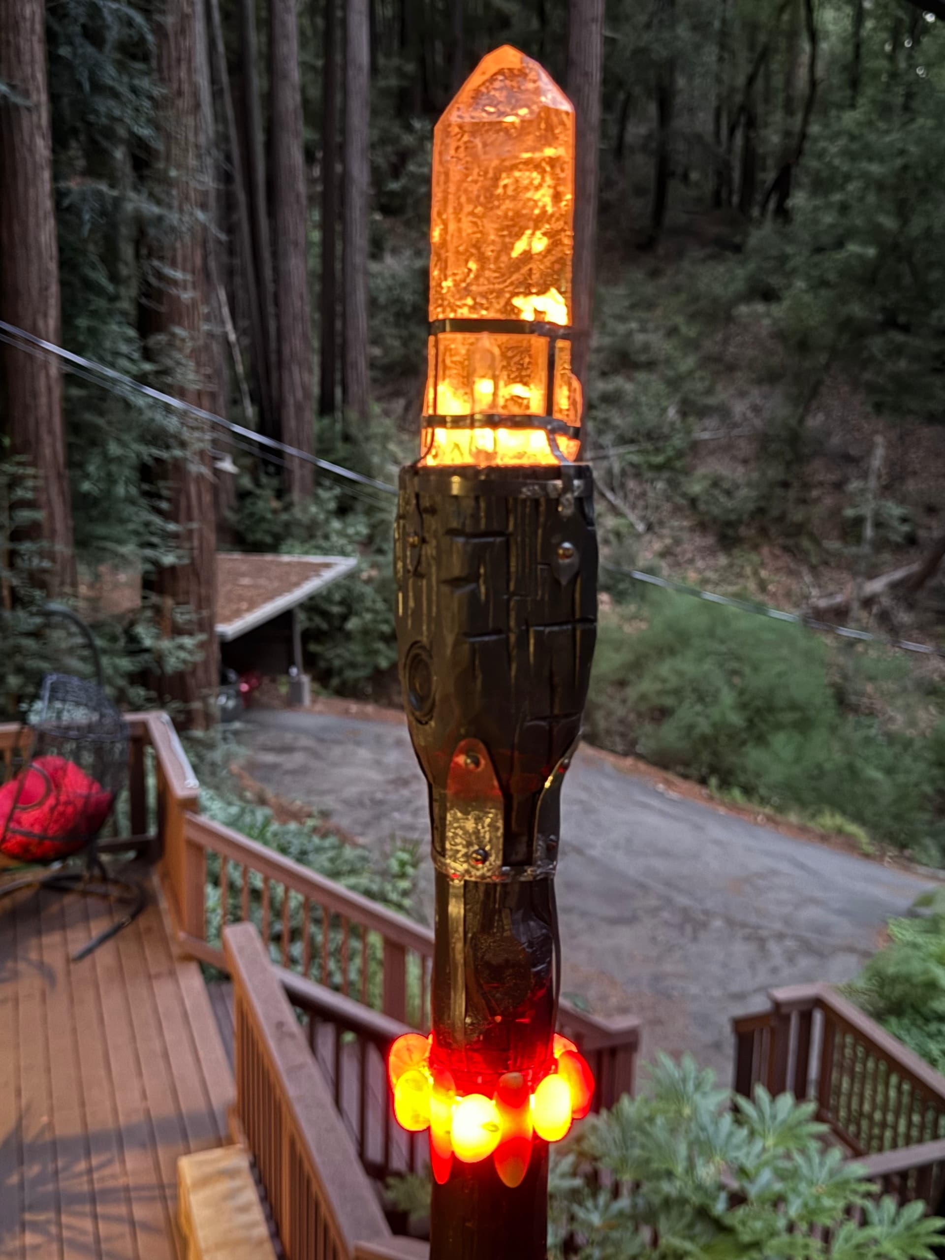 Materials: Redwood branch that fell on the roof; nickel metal ribbon, quartz (big ass crystal on top), obsidian (kill switch cover); Carmelite, Aventurine, more quartz.