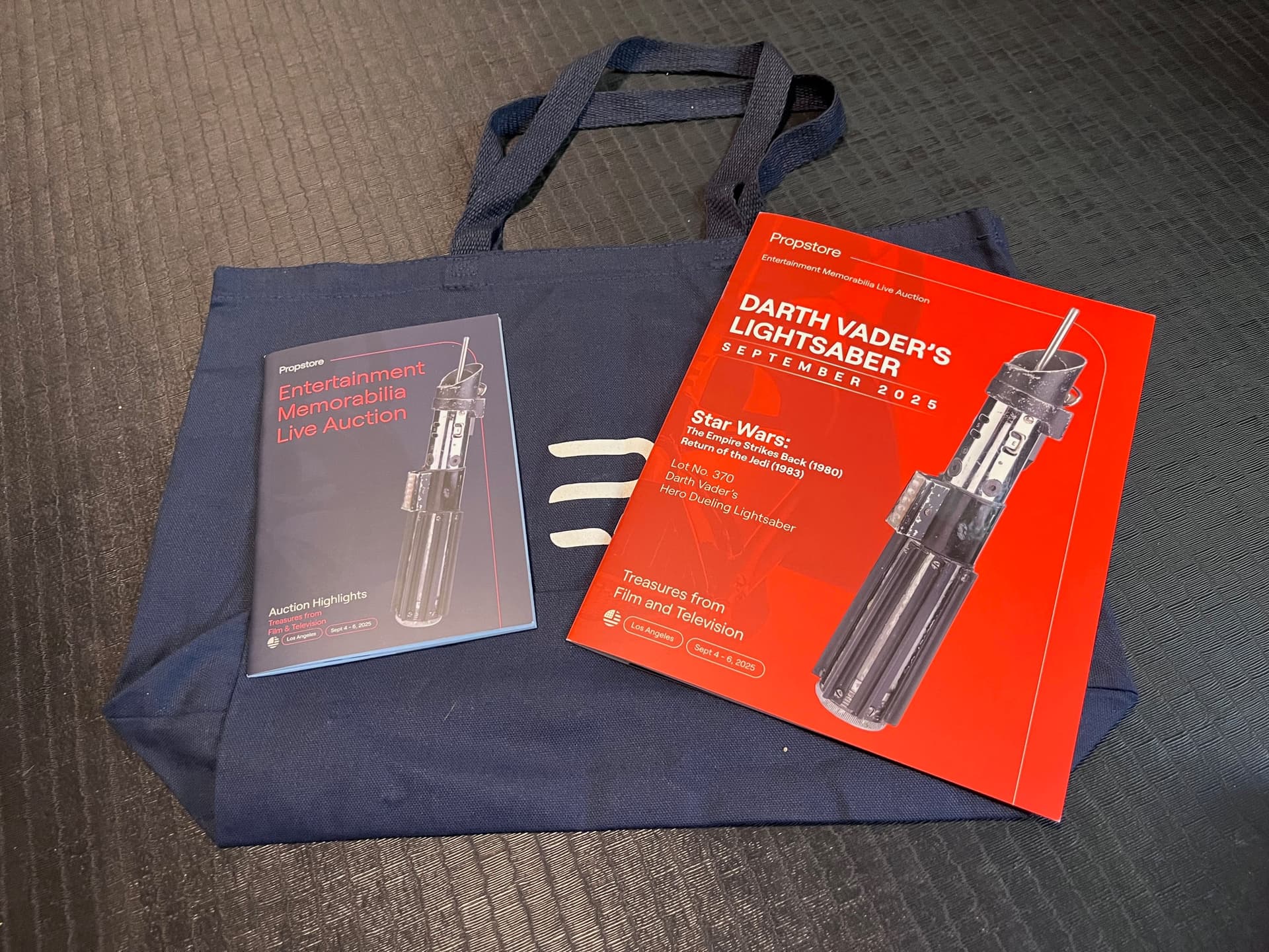 I learned a lot and would say it was worth the excruciating express-D-train-gone-local on the way home. Also, excellent swag with a tote (meh), a partial catalogue (the full one is $75 and sold out, but viewable here), and a very nice collectable book describing the $2 million USD Vader Saber with detailed screen matching photos and even an xray.